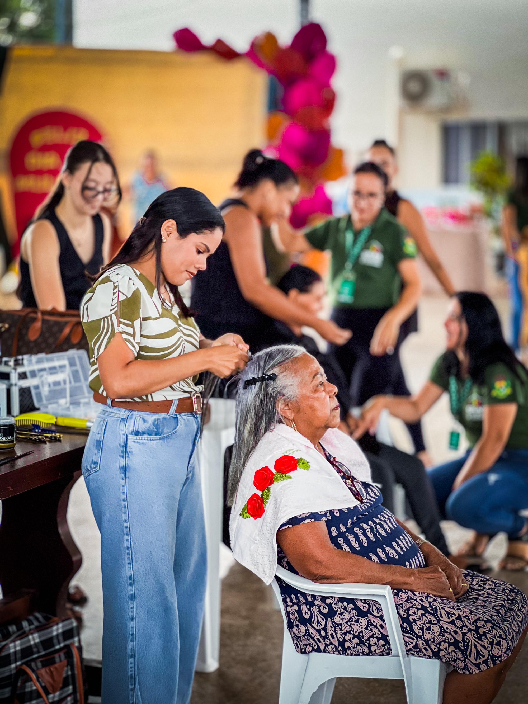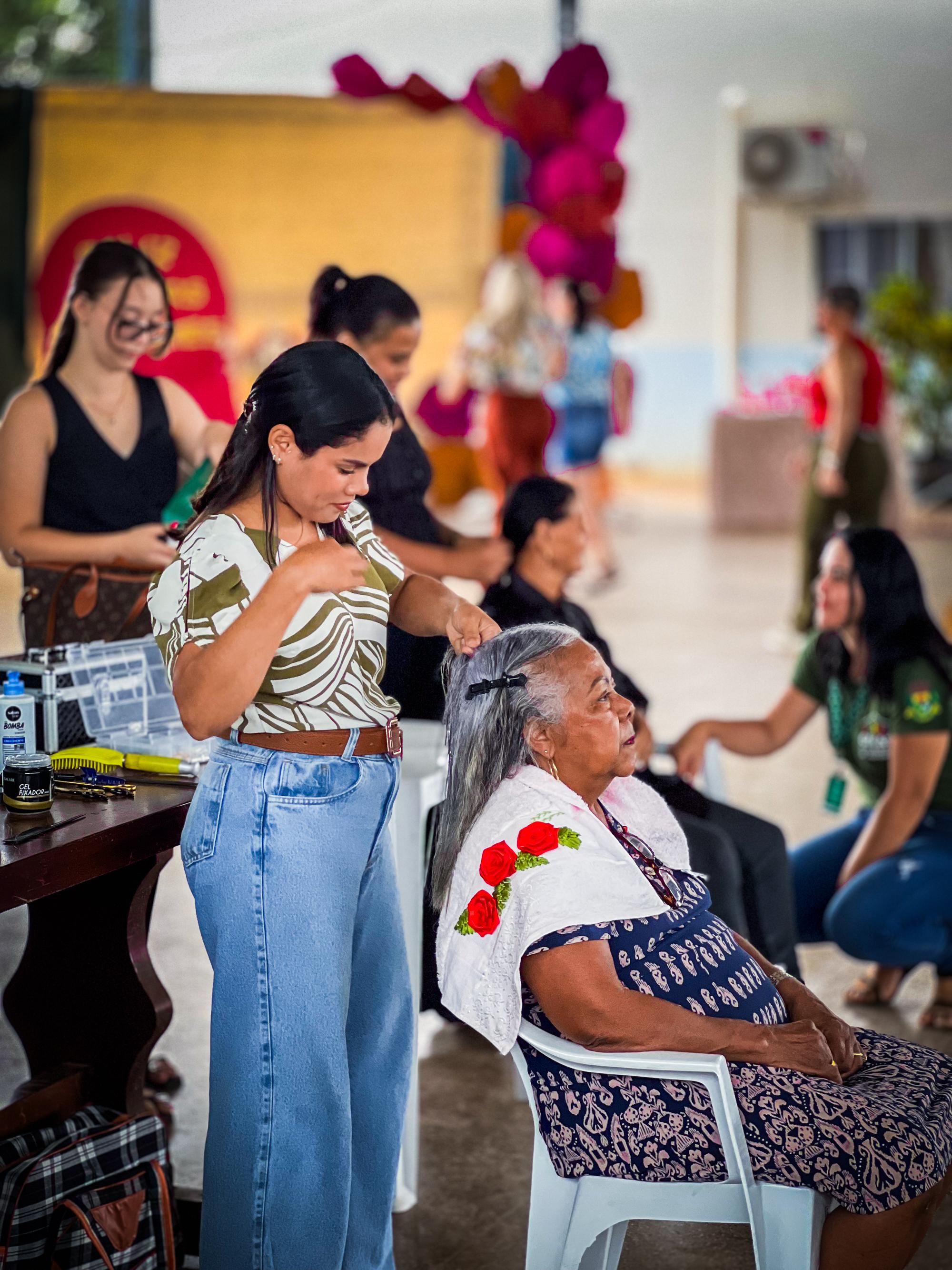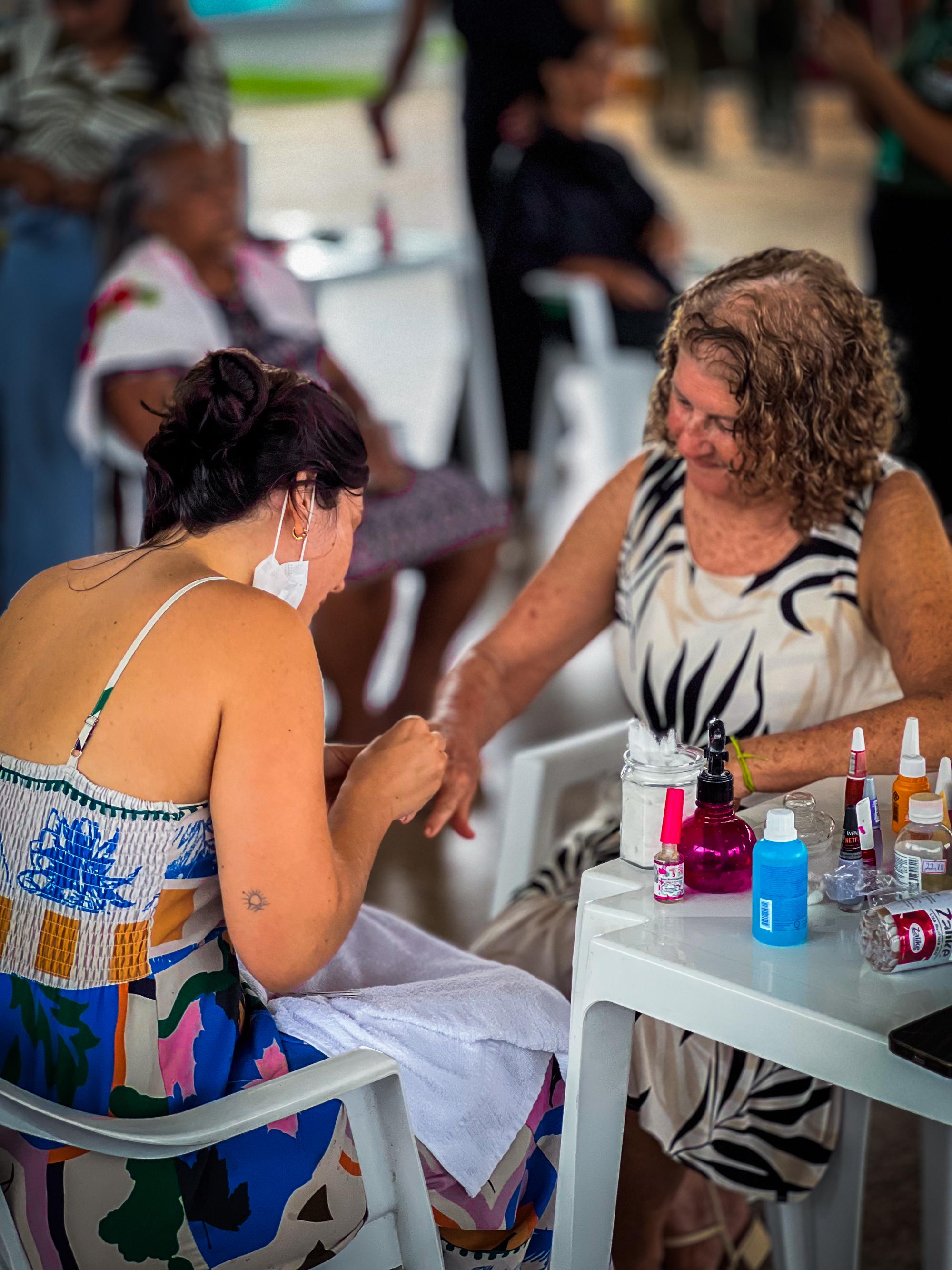 Entre as atividades oferecidas estiveram atendimentos de beleza, com profissionais realizando serviços de manicure, maquiagem, cabeleireira e penteados, proporcionando autoestima e momentos de cuidado pessoal às participantes.