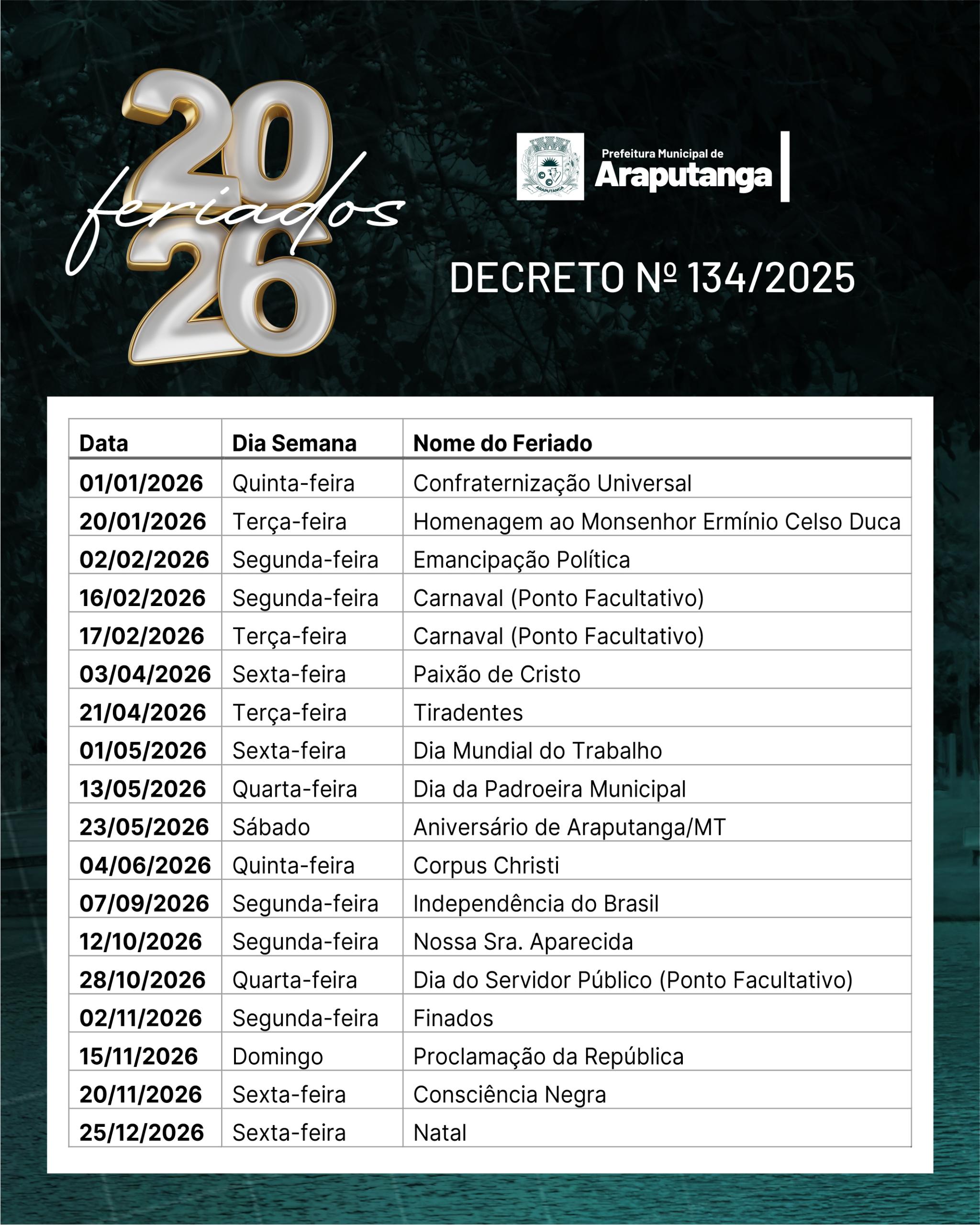 A Prefeitura Municipal de Araputanga divulgou, nesta quinta-feira (27), o Decreto nº 134/2025, que estabelece oficialmente os feriados nacionais, estaduais, municipais e os pontos facultativos válidos para o ano de 2026.