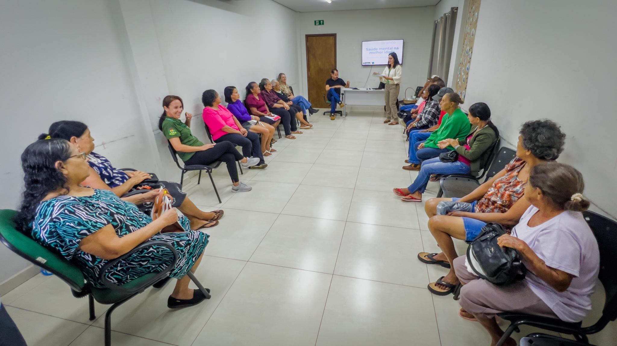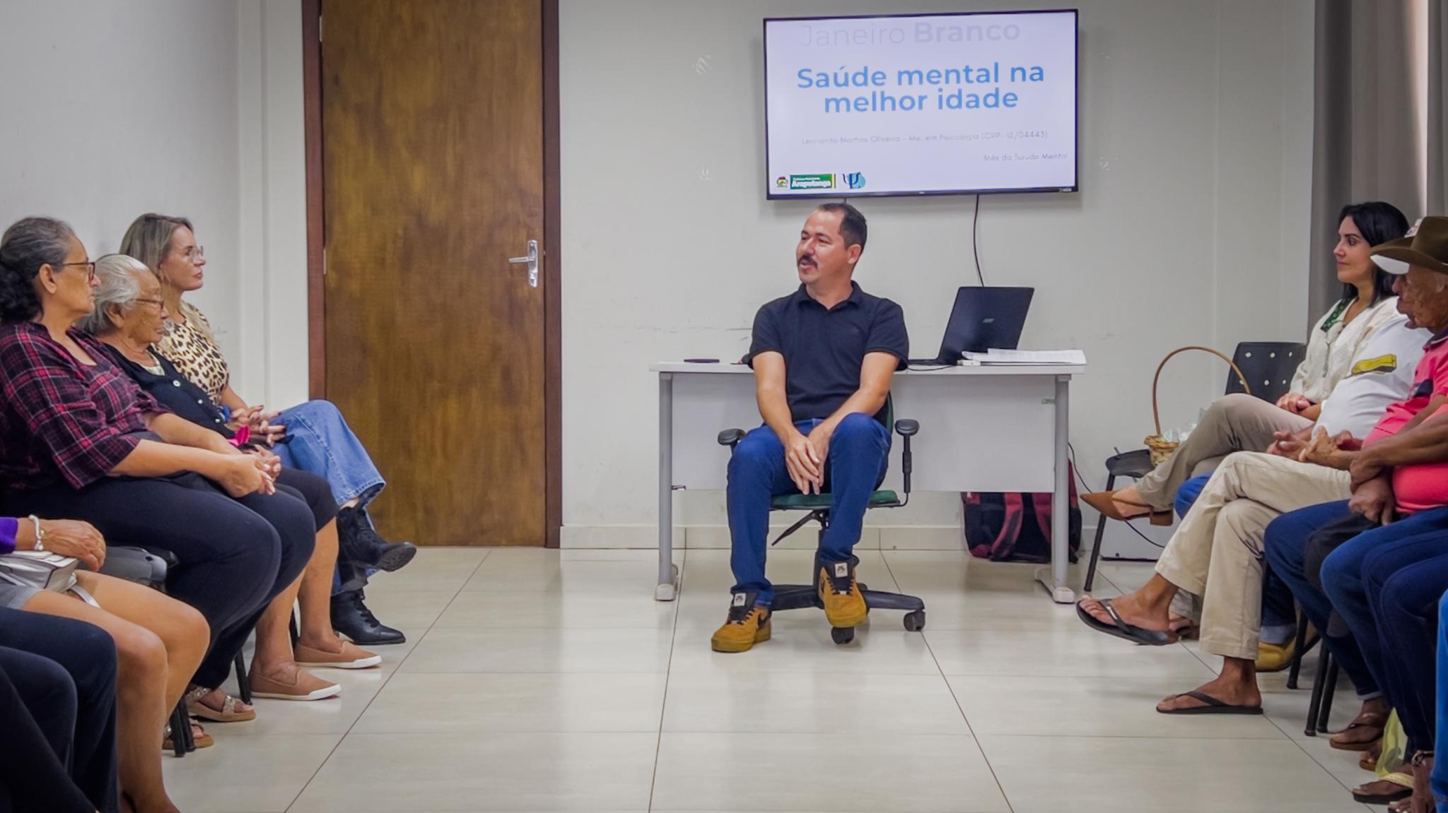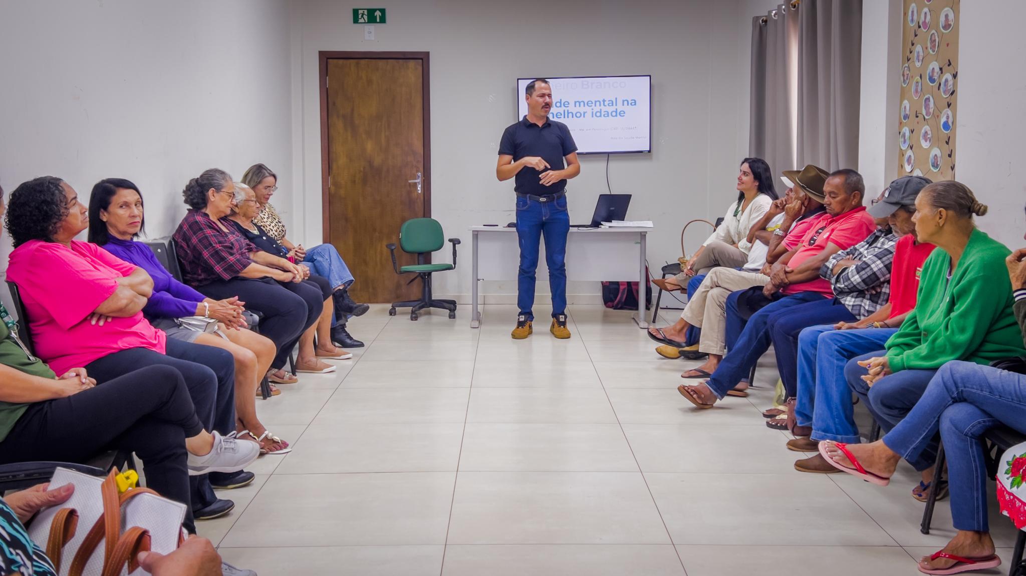 A atividade foi conduzida pelo psicólogo Me. Leonardo Martins Oliveira (CRP 18/04443), profissional da Secretaria Municipal de Saúde, que abordou temas relacionados à saúde mental na terceira idade, destacando como fatores emocionais influenciam diretamente na qualidade de vida, no bem-estar físico e nas relações sociais dos idosos.